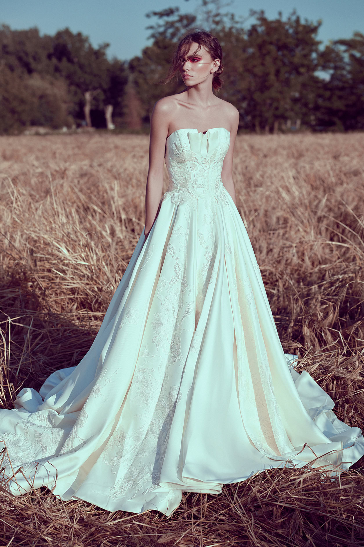 Ball gown mikado dress with a pleated bodice and appliqués of embroidery. Meticulous details on the back of the dress come to emphasize the cathedral train for a modern royal look.