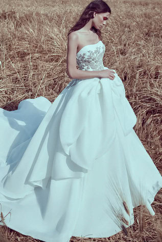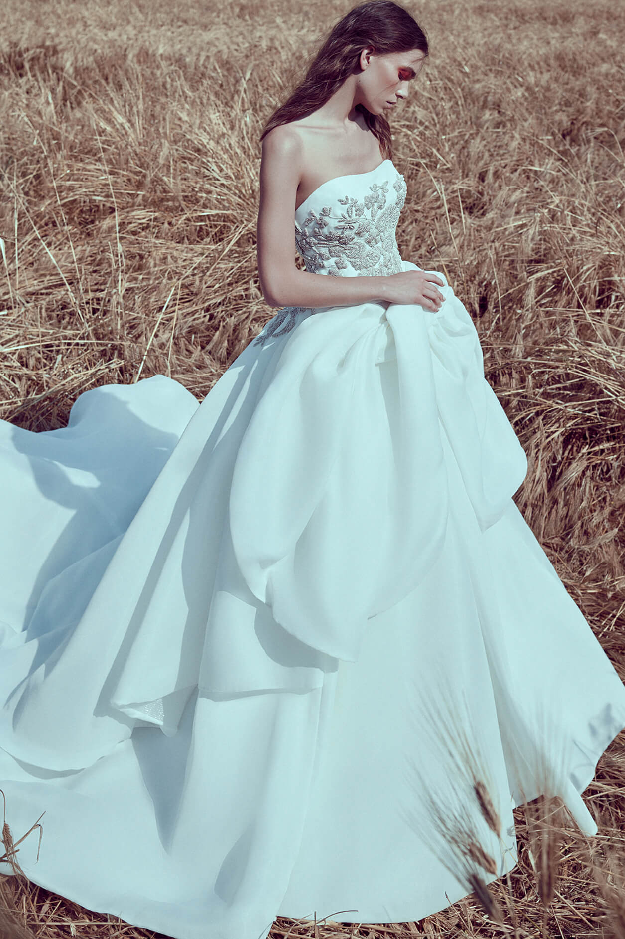 Simple yet sophisticated, this dress is the perfect choice for the modern and cosmopolitan bride. A classic strapless cut is spruced up with an intriguing front bow and a silver vintage beading on the bodice for a unique versatile look.
