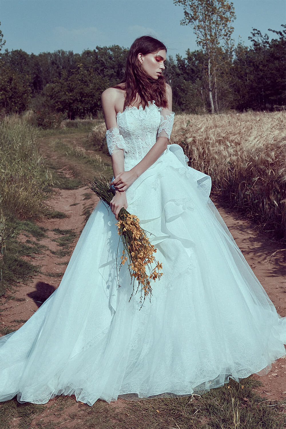 This one-sided ruffled dress embodies bohemian elegance, combining a voluminous skirt with free-spirited details such as a boho-chic bodice and small sheer sleeves.