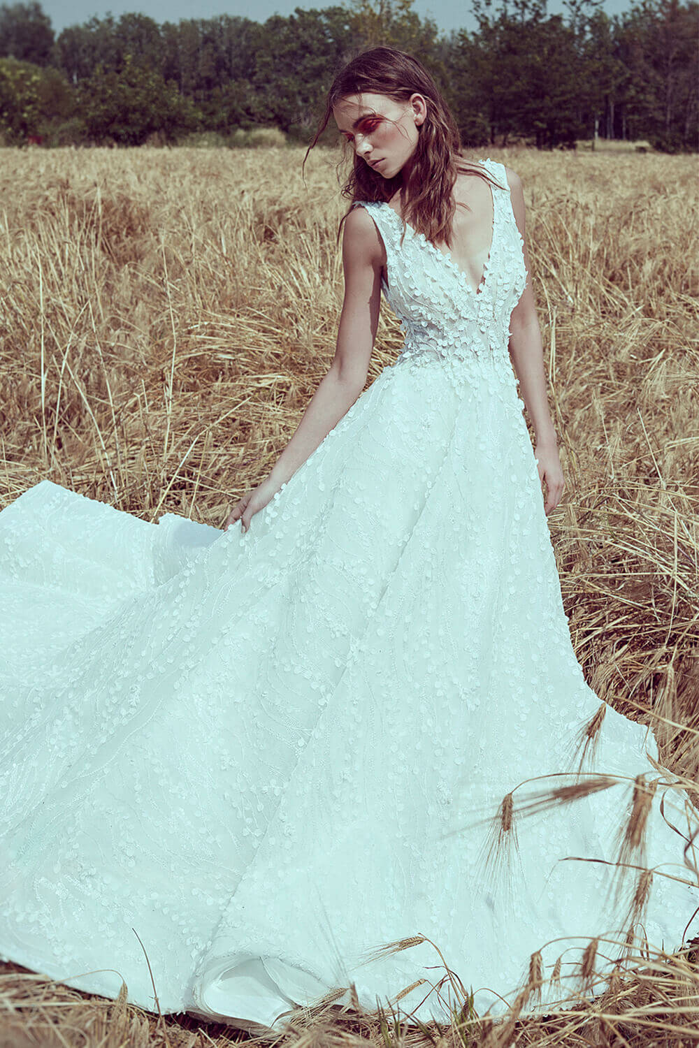 The royal look and V-neckline appear again in this bridal piece. Fully adorned with petals and garnished with chantilly, the dress inspires freshness and romance.