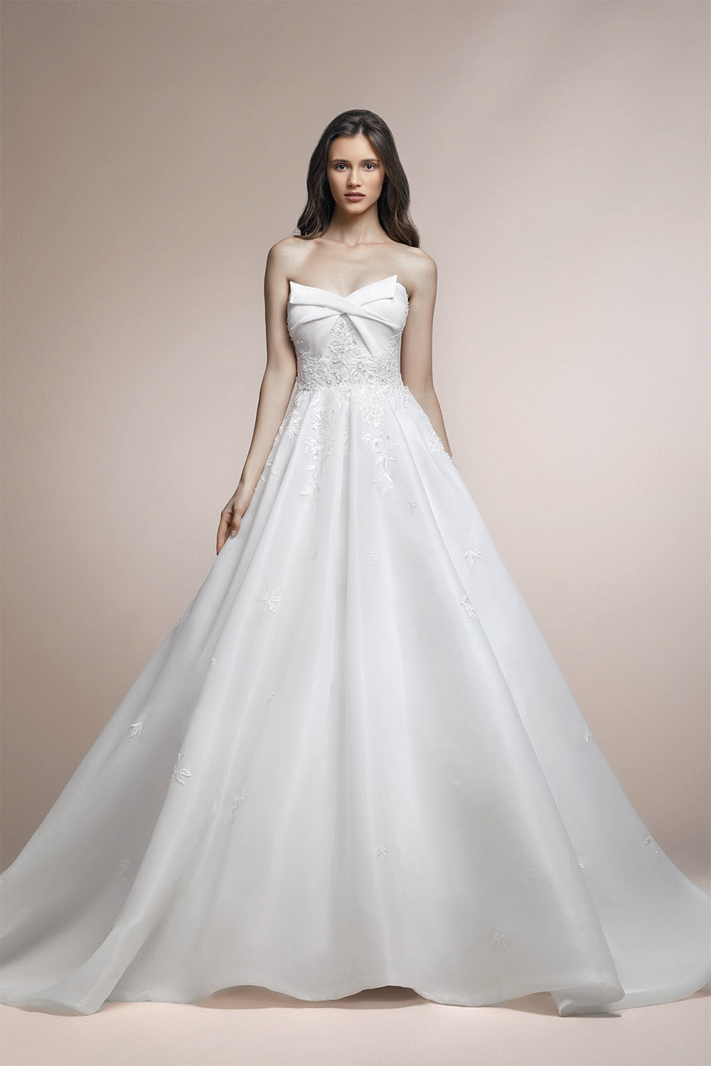A strapless double organza ballgown distinguished by a draped bodice and an incrusted lace overall look.