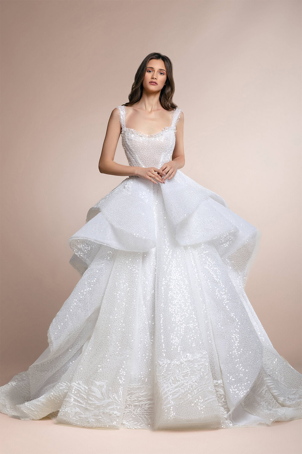A square neckline aristocratic ballgown distinguished by its ruffled peplum, its sparkling fabric, draped bodice, open back, and unfinished raw edge style. The gleaming effect is emphasized by incrusted embroidered lace details covering the entire dress.