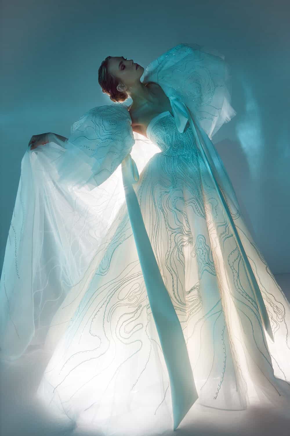 Veronica is a masterpiece combining between the modern styles and classic looks. It’s a straight strapless neckline with a tight corset, featuring the smallest V cut at the center of the neckline. It flares in an A-line skirt, fully designed with beading Cornelly details. Veronica is paired with a cape, beaded with crystals and pearls.