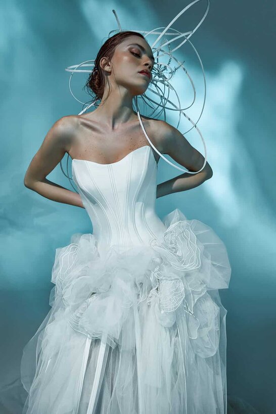 The ultimate edgy bridal look with a strapless curved neckline and a tight corset of Mikado fabric, featuring boning details, emphasizing the shape of the waist. It’s paired with a tulle skirt designed with ruffled bunching.
