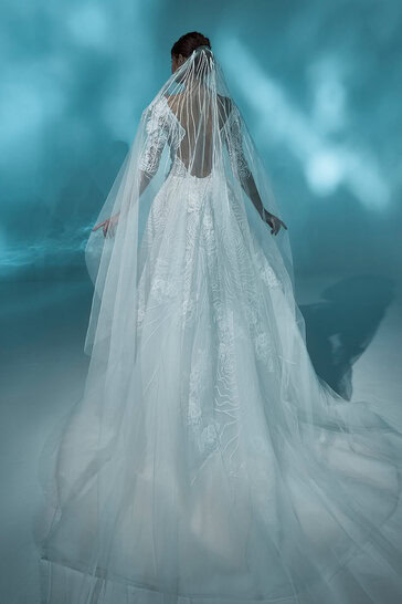 Viviane is a mermaid wedding dress with a matching over-skirt. The gown is fully designed with cornelly designs and tulle fabrics, mimicking the ripple effect on the surface of the water. It’s paired with long sheer sleeves, embroidered with similar patterns to the ones all over the dress.