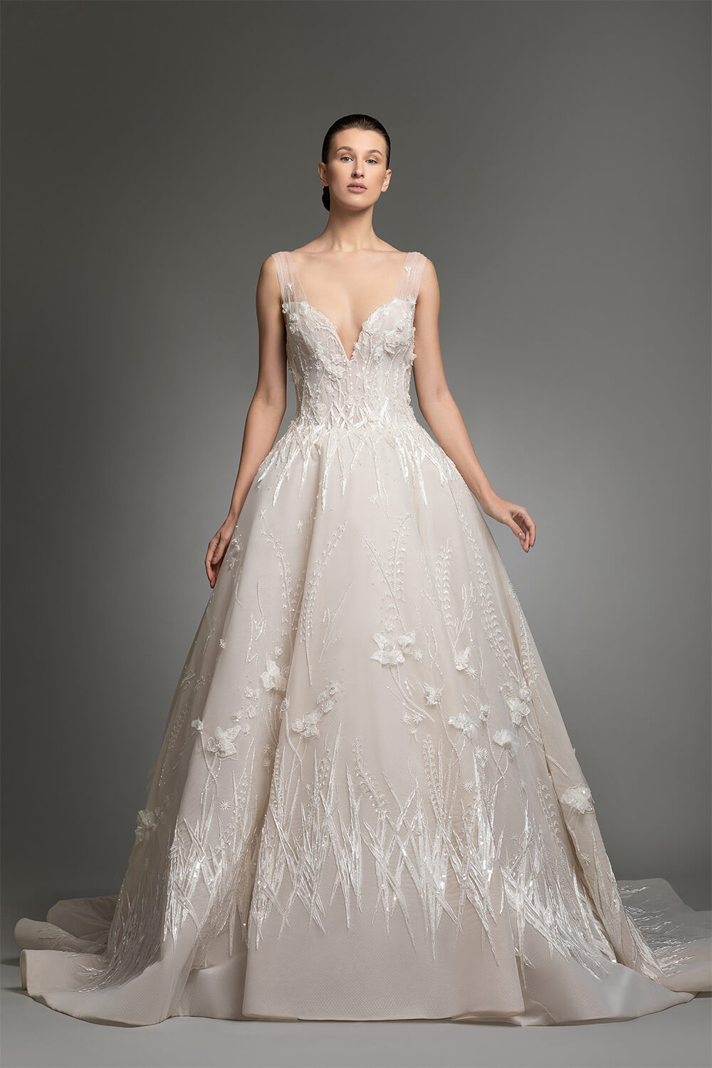 V-neckline front and back dress distinguished by exquisite floral hand embroidered celebrating the blossoming spring.